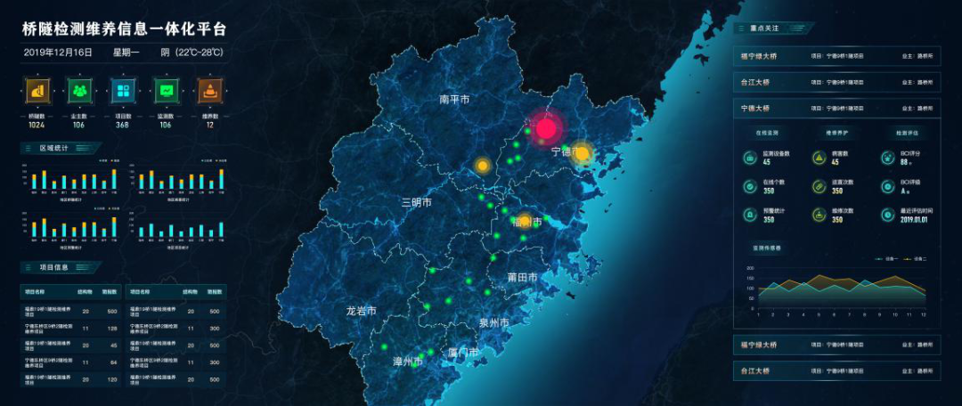 云平台现已成功接入三江口大桥、鹤林高架桥、福宁汇率桥等省内标志性桥梁,并依托该平台开展了福鼎市19桥1隧、宁德市9桥2隧检测监测维养一体化技术服务项目。